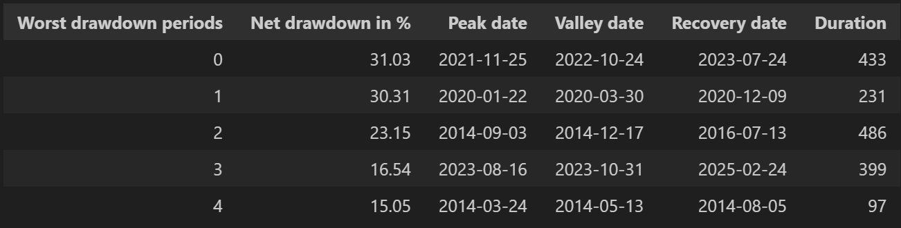 Drawndown khi test trên toàn bộ dữ liệu cũng cho thấy mức sụt lớn nhất là 31% so với mức 23% trên tệp train. Tuy nhiên, để có thể đánh giá tốt hơn mình sẽ so sánh với index trong cùng thời điểm.