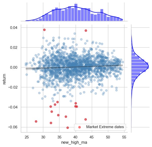 Ngoài ra thì có vẻ như new_high_MA cũng có tính mean reversion khá tốt, khi cứ chạm mốc 2std sẽ quay đầu.