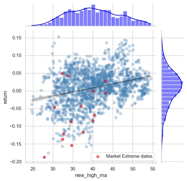 Chart ở trên cho thấy là so với VNINDEX, new_high_MA có mức độ biến động khá tương đồng và tương đối ổn định hơn. Đặc biệt có vẻ như trong dài hạn thì divergence của VNINDEX và New_high_MA sẽ là tín hiệu tốt cho 1 cú bullish mạnh và ngược lại.