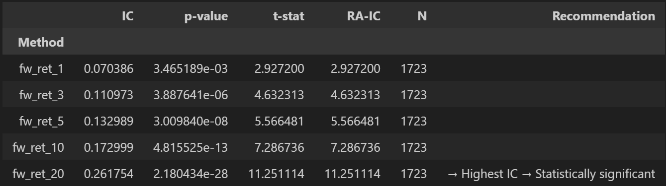 Information Coefficient (IC) cơ bản chỉ là dùng 1 số phép đo tương quan để xem mức độ tương quan giữa chỉ báo và lợi nhuận theo các khung thời gian khác nhau. Tuy nhiên khác biệt chính ở chỗ là phép đo tương quan thông thường sử dụng là Pearson, vốn chỉ đo tương quan tuyến tính, đó nếu biến động của 1 biến quá bé so với biến còn lại (nếu vẽ lên scatter chart thì nó co cụm) thì Pearson sẽ giải thích rất tệ. Phép đo trong IC thường sử dụng là Spearman hoặc Kendall, sẽ có thể đo được các tương quan không tuyến tính. Nôm na là các phép đo này sẽ rank trước và đo sau, do đó giải quyết được vấn đề co cụm hoặc không tuyến tính của Pearson, chi tiết thì các bạn có thể google để rõ hơn. Trong phạm vi bài này thì mình sẽ dùng Spearman để đo, kết quả đo IC của new_high_MA so với return các khung thời gian nắm giữ khác nhau như bảng sau: