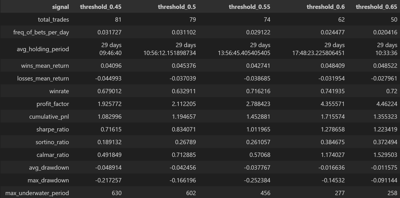 Vậy mình sẽ dựa vào đây để chọn threshold là 60%, trong đó có mức sharpe và sortino tốt, calmar hợp lý để test chiến lược.
