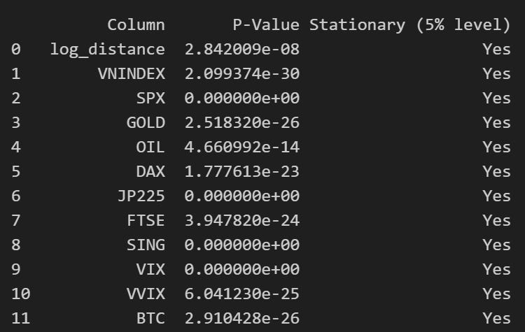 Bên cạnh đó, để hạn chế vấn đề của việc chuỗi thời gian có thể không ổn định, mình cũng tính lại biến ‘distance’ ở phần 1 (hiện được tính bằng lấy Market_FFR trừ đi Current_FFR) bằng cách lấy hiệu số của logarit của 2 biến này. Nó cũng phản ánh đặc tính liên tục (continuous) của lãi suất, đem tất cả các biến đó để kiểm định mức độ ổn định của chuỗi thời gian (kiểm định ADF) mình có kết quả như sau: