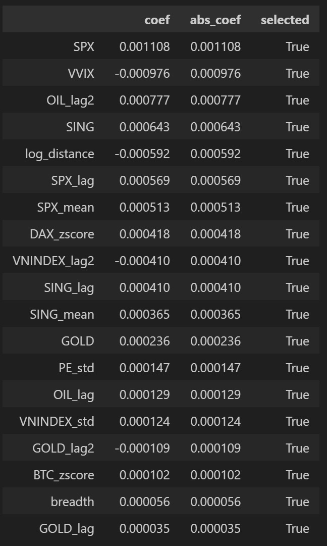 • Biến target sẽ là lợi nhuận 1 ngày của VNINDEX, khi chạy hồi quy mình sẽ dùng TimeseriesCV (đã có đề cập ở bài phân tích yếu tố cơ bản) để tìm ra hằng số phạt phù hợp để phạt vào phương trình và chọn ra các biến phù hợp.