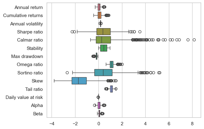 Alpha có mức độ phân bổ khá rộng và to hơn Beta đáng kể, có nghĩa là strategy này cũng có thể vẫn còn tiềm năng mining thêm. Tương tự với Sharpe và Sortino, tuy nhiên thì Sortino vùng phân bổ cũng rất rộng.