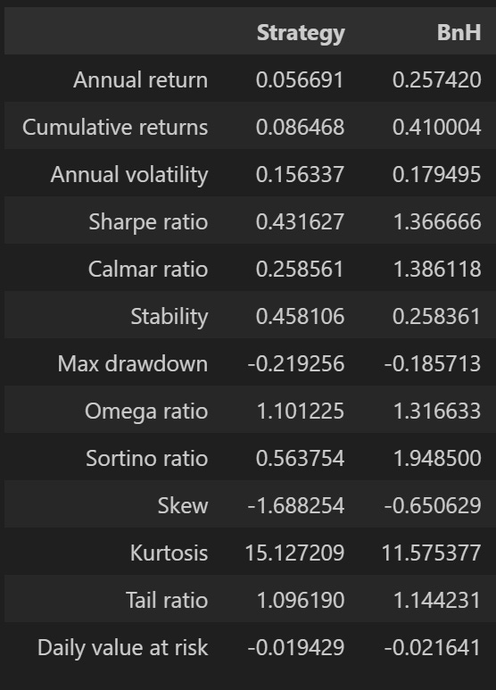 Khi forecast dữ liệu từ 01-01-2024 đến nay trên tệp test, có thể thấy model vẫn tiên đoán khá tốt các trạng thái rủi ro cao (vùng màu vàng) khi volatility của thị trường đang đặc biệt tăng vào các giai đoạn đó. Đặc biệt hơn, model còn tiên đoán được cả đoạn thuế (=]], nghi ngờ quá). Tuy nhiên, khi chạy với strategy là buy and hold khi risk-on và quan sát khi risk-off, kết quả không tốt lắm với: