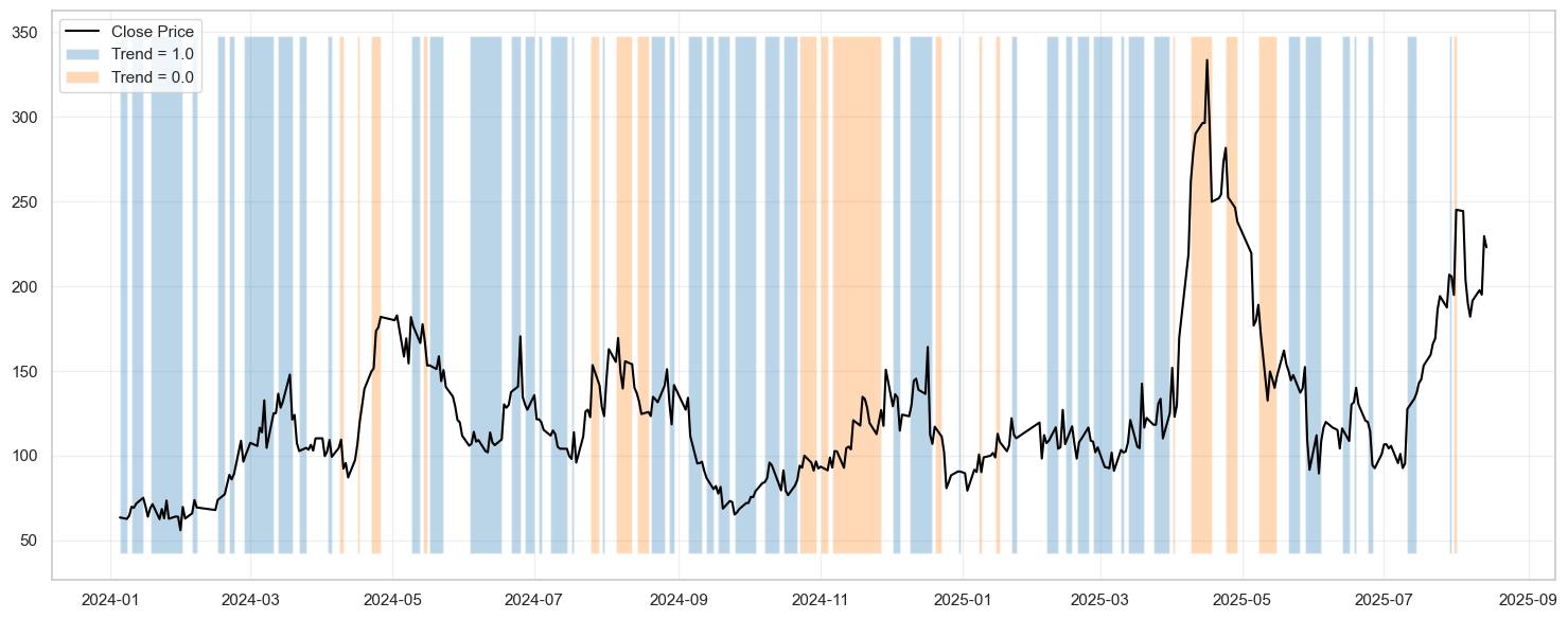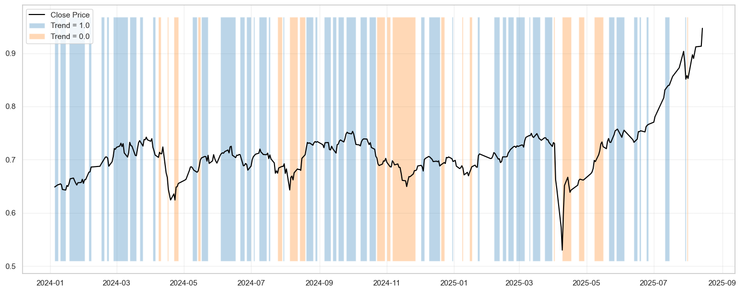 Với màu xanh là risk-on và màu vàng là risk-off. Có thể thấy, thuật toán phân loại khá ổn định khi phần lớn khi risk-on, volatility duy trì ở mức khá thấp, trend của VNINDEX cũng khá mượt và ổn định.